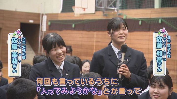 世永アナ:「お姉さんは何て⾔ってた?」2年 佐藤 茉莉さん(姉):「なんて⾔ったっけ…」2年 佐藤 和音さん(妹):「え~?まじで~みたいな最初は微妙だったんですけど、何回も⾔っているうちに『⼊ってみようかな』とか⾔って、アタックしたら⼊ってくれました」世永アナ:「⼝説き落としたんだね」