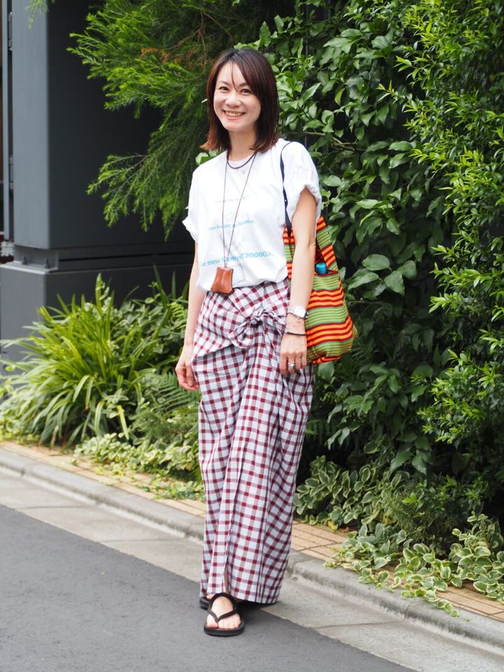 夏はTシャツやタンクトップなど、着心地のいいアイテムを選ぶことが多いというりんさん。「スタッフTシャツ風のデザインが気に入って購入しました。トップスがラフな分、ボトムはスカートを合わせて女性らしい着こなしを意識しました」。チェック柄スカートは巻きスカートのような立体感のあるデザインで、存在感たっぷり。