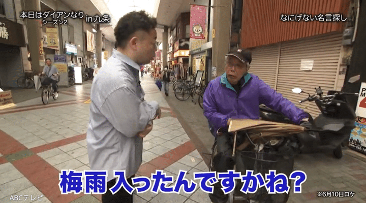 そんな中、自転車に乗った高齢の男性を捕まえる。早速、ユースケが「梅雨入ったんですかね?」と尋ねると、「入ったんとちゃうか」と気さくに応えてくれた。卓球をしてきたというその男性に成績を聞くと、「連戦連勝…相手が」とまさかの答えが。それに2人が「相手がかい!」と軽快につっこんでいく。