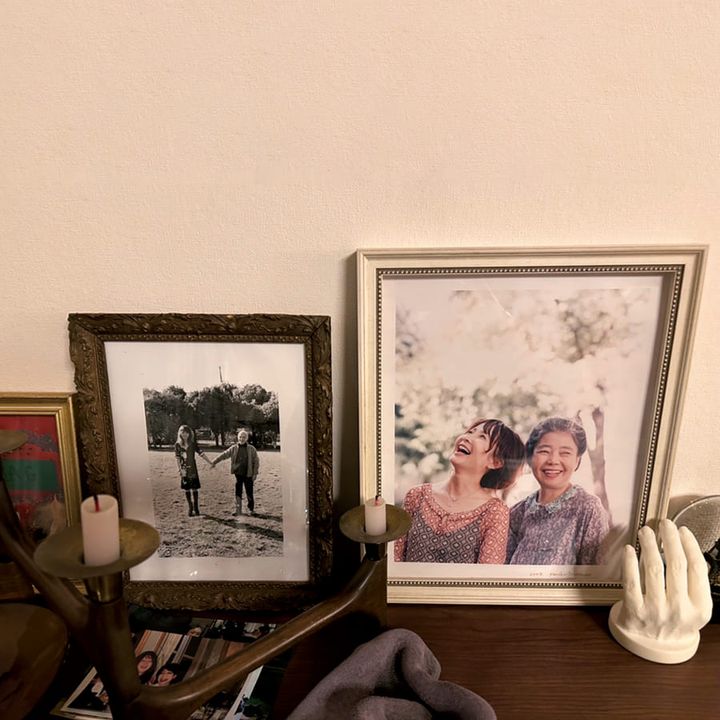 右は、お世話になった樹木希林さんとの2ショット。左は、谷川俊太郎さんと10年ほど前に対談させていただいたときのもの。亡くなる前からお守りのように飾っていました。