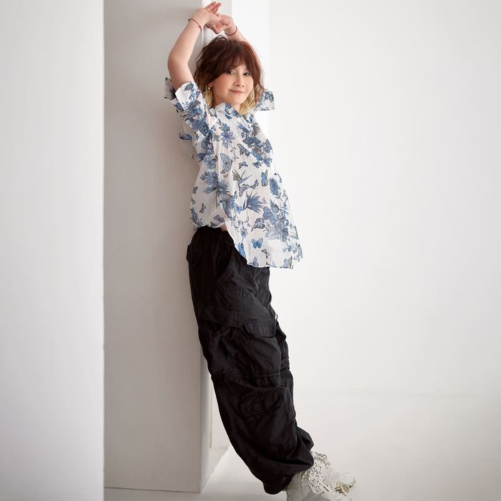 撮影のときはいつもセルフスタイリングで。「それが楽しいの」と笑うYOUさん。ドレッシーなボタニカルプリントのトップスは、随分前に購入したというメンズのディオールのシャツをリメイクしたもの。バレンシアガのワークパンツに後ろだけインしたラフな着こなしはさすが。スニーカーは、バレンシアガのトリプルS。ファッション性はもちろん分厚いソールは履き心地が抜群。