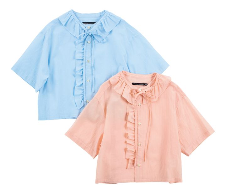 国産の素材を使い、ベーシックでいてひとひねりある大人の日常着を提案する〈ニコルソン アンド ニコルソン〉。フリルが目を引くブラウスは、身幅の広いボックスシルエットが抜け感のあるスタイルに導く。襟が取り外しできるので甘くなりすぎず、装いに合わせてアレンジを楽しめる。ソフトなタッチのシルク混コットン生地は、さりげない光沢も持ち味。