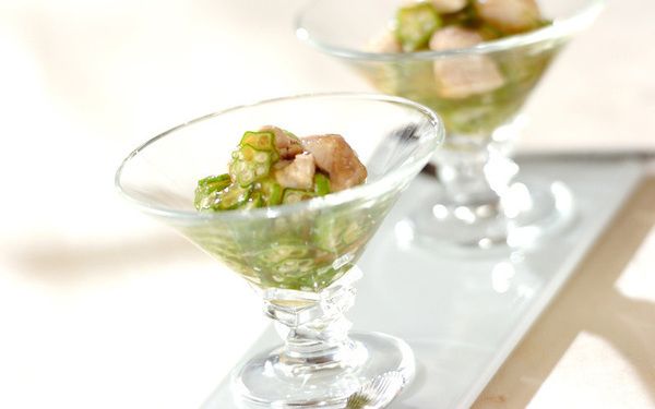 オクラと鶏もも肉といった身近な食材で手軽に作れる鶏肉のゼリー寄せ。顆粒チキンスープにポン酢しょうゆを加えることで、柑橘系の爽やかな酸味が食欲を誘います。ジューシーな鶏肉と生オクラのネバネバ食感がくせになる、さっぱりおいしい夏向けメニューです。