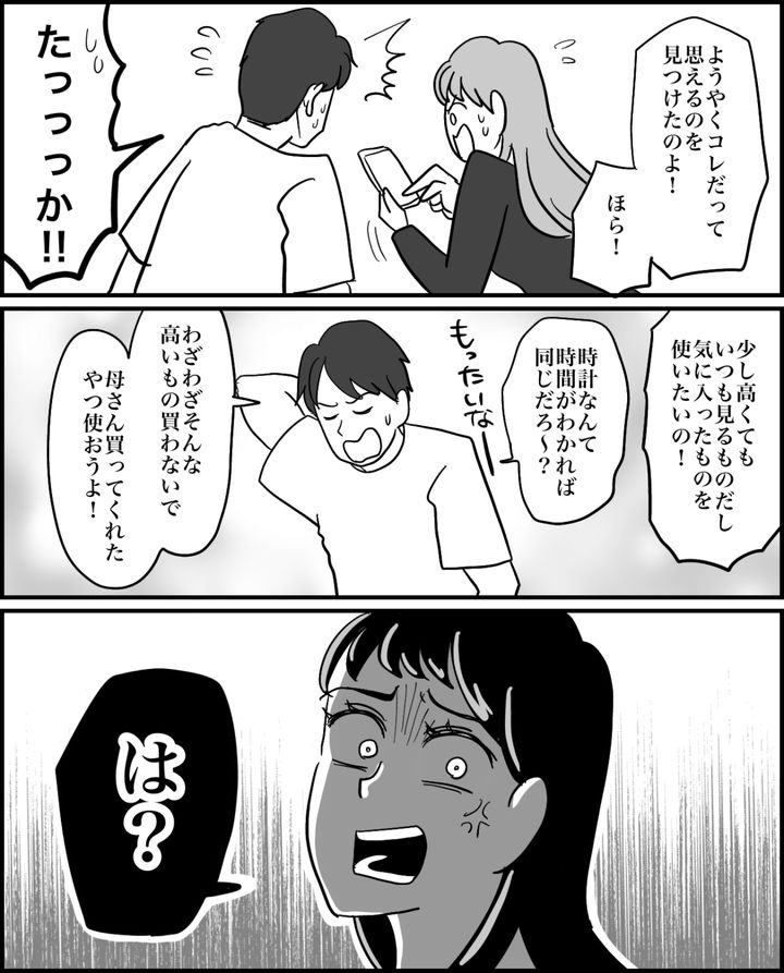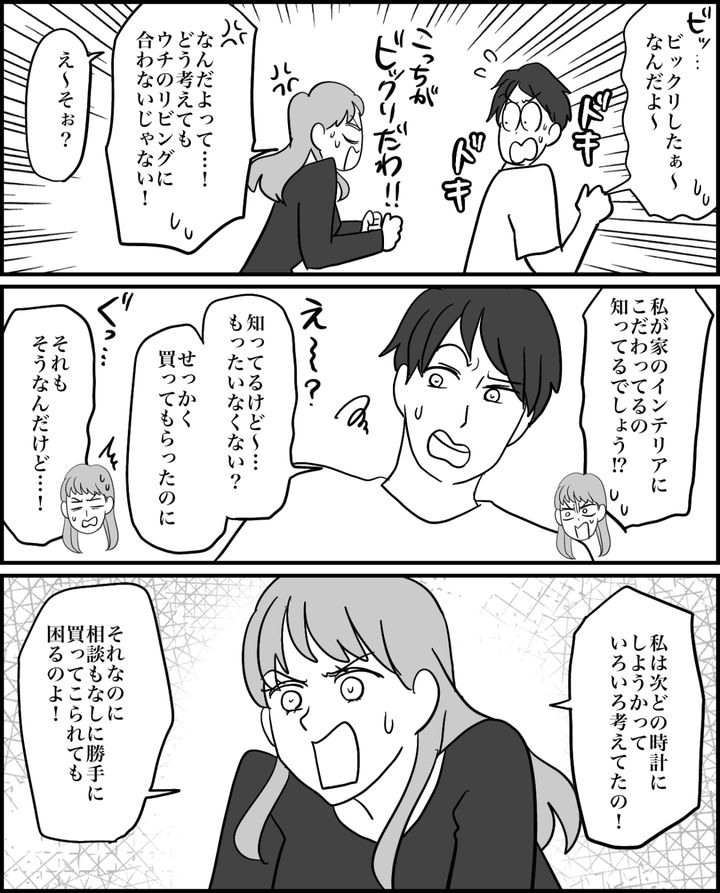 しかし夫は「もったいないから使おう」と言ってきたのです! しかも「時計なんて時間がわかれば同じ」とまで言い放って……。いや、その考えも別に間違ってはいないと思います。でも私がインテリアにこだわってわが家の空間を作り上げてきたのを知っていて、その発言はないでしょう。私は思わずイラついてしまったのでした。