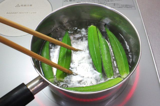 4. オクラのヘタとガクを取り除いて塩を振って板ずりし、沸騰したお湯でオクラを混ぜながら20~30秒茹でます。