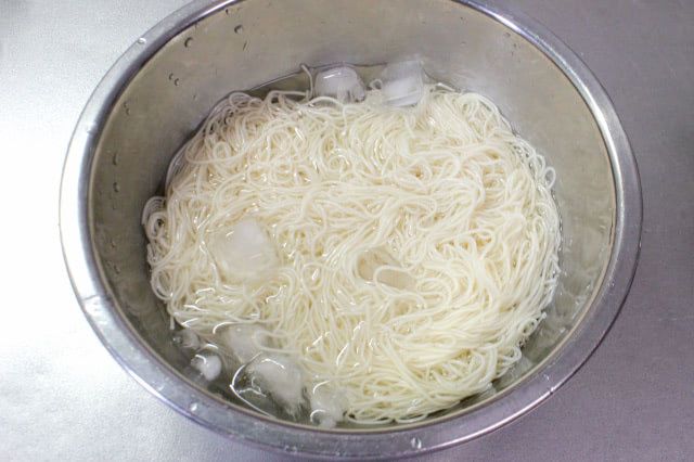 5. そうめんを1分半茹でて流水で揉み洗いし、氷水で締めて水気を切ります。