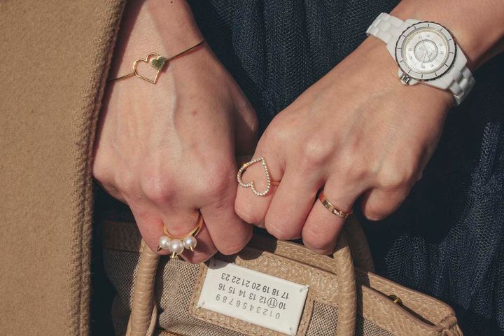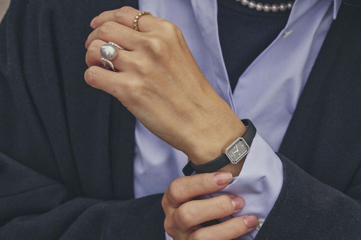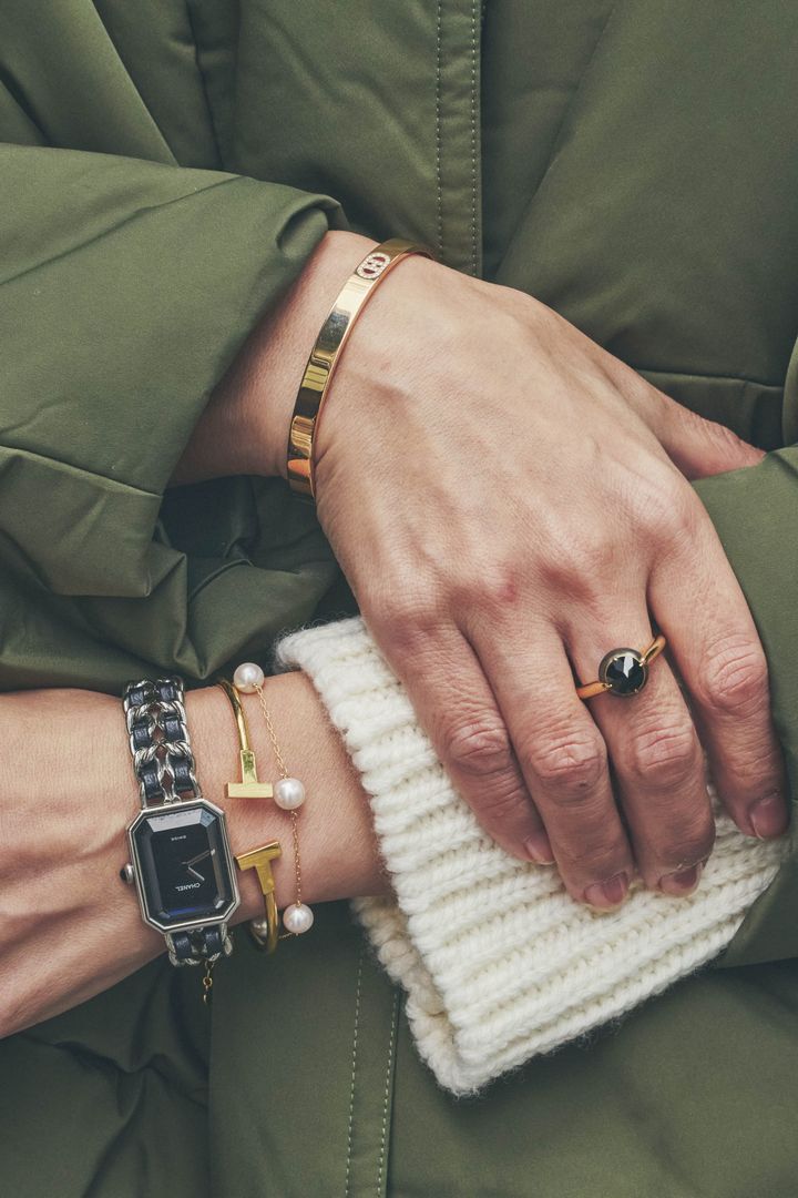 プルミエールのウォッチは、チェーンバッグやチェーンウォレットと合わせたくて購入したアイテム。カジュアルなコーデもこのウォッチを合わせるだけでフェミニンに、上品になるので、気に入って着用しています。右手に合わせたタサキのリングは、モードに寄せてくれるところが気に入ってます。