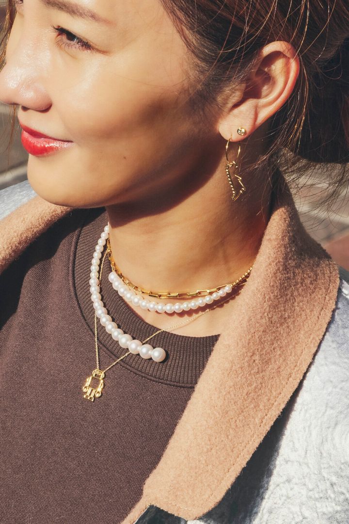 ウォッチは20代の頃の誕生日に、仕事でフランクフルトにいたのですが、誕生日も仕事を頑張っている自分にご褒美として、購入しました。シャネルの店舗でシャンパンとバースデーソングで祝っていただき、思い出深いアイテムです。ネイビーやモノトーンコーデにブラックパールを合わせるのがマイブーム。リングとピアスはそれぞれ別々のブランドですが色やボリュームがセット使いできそうで購入しました。PDPAOLAのリングは遊び心のあるデザインが多く、娘と一緒に選ぶことが多いです。