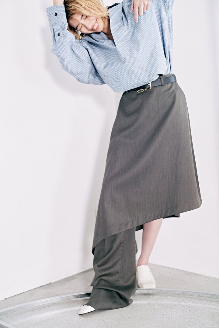 「コレクションで登場したときから面白いバランスだなと思っていたボトム。スカートがベースになっていて、片足のパンツは取り外し可能なデザインなの! ファッションアディクトの心をくすぐります」