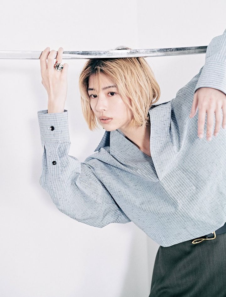「仕立ても素材もいい服こそ、旬度や遊びのあるデザインを選ぶようにしています。歳を重ねるほど、質のよさがときに狙った以上の重厚感を出してしまう気がするから。かっこよさとヌケ感のさじ加減が絶妙なボッテガ・ヴェネタには、ワードローブに今すぐ取り入れたいモードでウェアラブルな服がたくさん。特にイタリアブランドらしい生地にこだわりを感じるシャツを今季は狙っています。メンズライクでパリッとしてて、着ただけでかたちがキマる。襟を抜いて着てもおしゃれ。本当に計算された服だと思う」