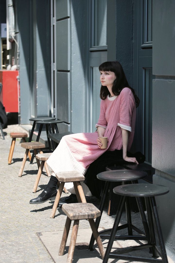 淡いピンクのギャザーワンピースが主役。そのロマンティックなムードを裏切るかのように、靴下やシューズ、アウターはブラックを選択。媚びない甘辛スタイルがお見事。