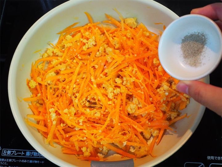3. にんじんが少し柔らかくなってきたら、油を回し入れ、塩、こしょうで味を整える。軽く炒め合わせたら完成。