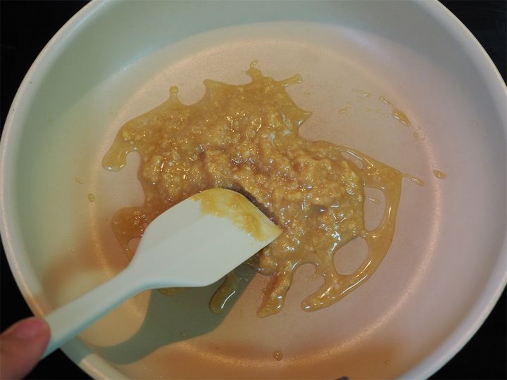 1. フライパンにみそ、酒、砂糖、うま味調味料を入れ、弱火にかける。シリコンベラでみそを練るように混ぜながら、全体をなじませていく。