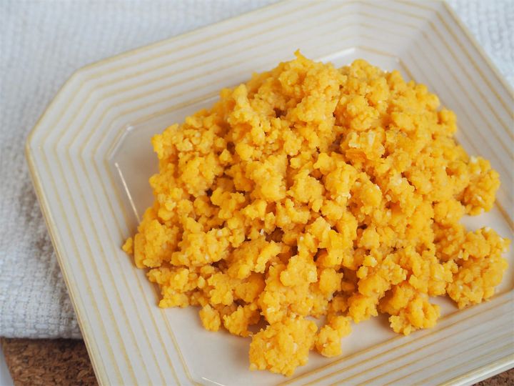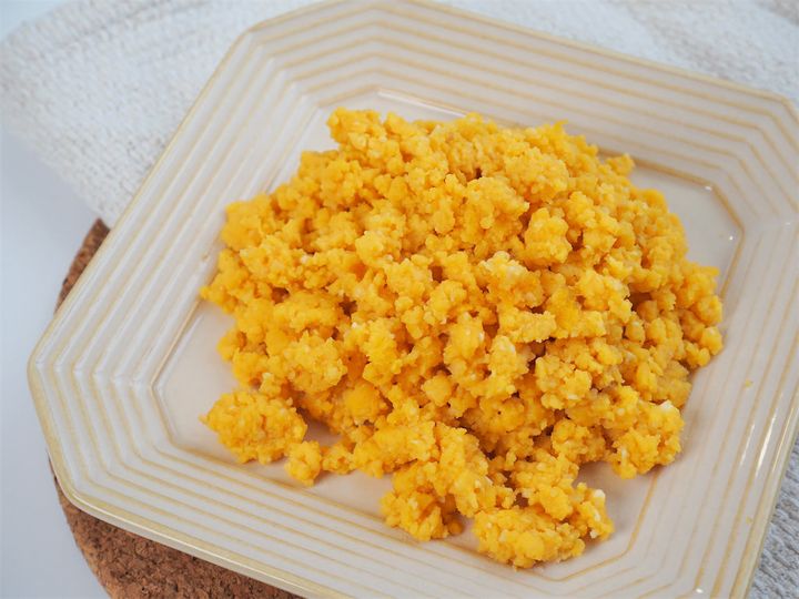 3. 再びフライパンを弱火にかけ、2の卵を加える。シリコンベラで練るようにゆっくりと混ぜ続ける。ポロポロそぼろ状になったら完成!