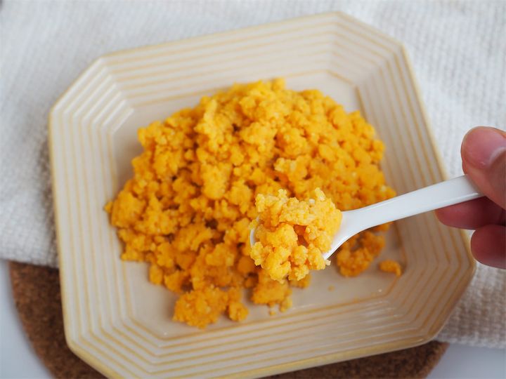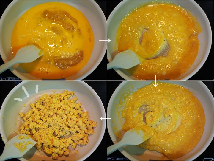 最初はサラッとしていますが、次第にとろみが出てきて、5分ほどでぽろぽろの炒り卵状に仕上がります。