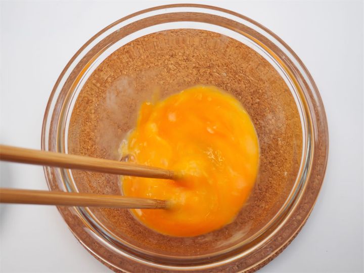 2. 1の火を一度止め、卵を別のボウルに割り入れ、溶いておく。