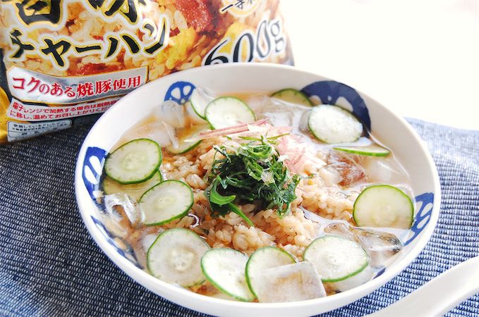3. レンチンした炒飯に2をトッピングし、氷水とめんつゆを混ぜたものを注いで出来上がり。