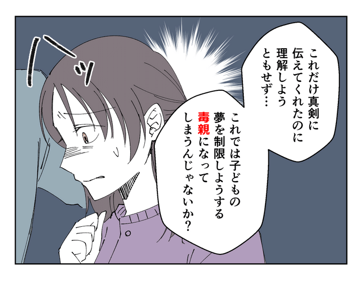 親に「心配だから」「あなたのために」と言われたら、子どもとしては「言うことを聞かなければ」と思ってしまいますよね。しかし子どもだって意思を持った人間です。間違った方向に進まないようある程度舵取りしてあげることも必要かもしれませんが、意思や覚悟をねじ伏せてまでコントロールしようとするのは「毒」になってしまうのではないでしょうか。ユキコさん、ズバッと言われたことでようやく自分の過ちに気付き始めます。