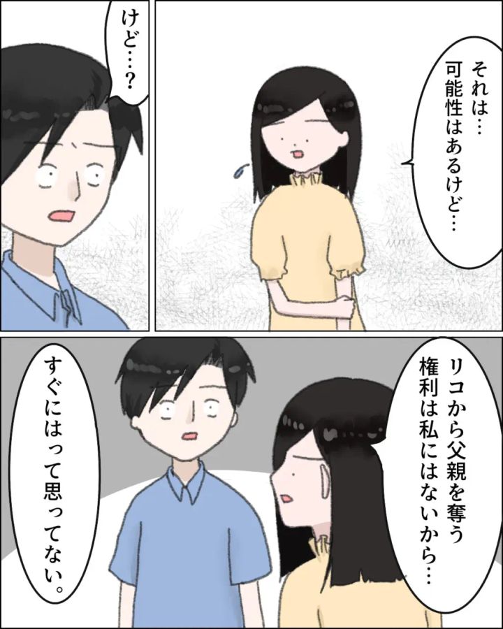 「俺と別れるつもりなのか」と言ったカズヒデに私は「それは・・・可能性はあるけど・・・リコから父親を奪う権利は私にはないから・・・すぐにはって思ってない。」と伝えました。