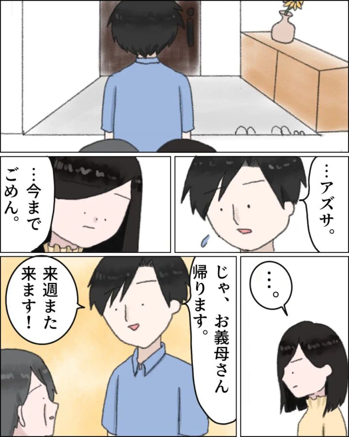 そして帰り際に「アズサ・・・今までごめん」と謝り「じゃ、お義母さん帰ります。来週また来ます!」と母に言いました。