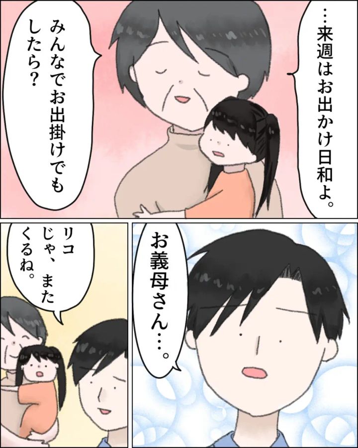 母はカズヒデに「来週はお出かけ日和よ。みんなでお出かけでもしたら?」と言いました。カズヒデは「お義母さん・・・」と呟いて「リコじゃ、またくるね」と言って帰っていきました。