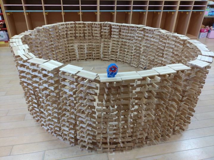 一見すると積み木で作られたミニチュア版かと思いきや、使われている積み木の数は膨大で、まるで本物の巨大建造物のような雰囲気を醸し出しています。実際に「大屋根リングを作ってみよう!」と自ら行動に移した点が素晴らしいですね。
