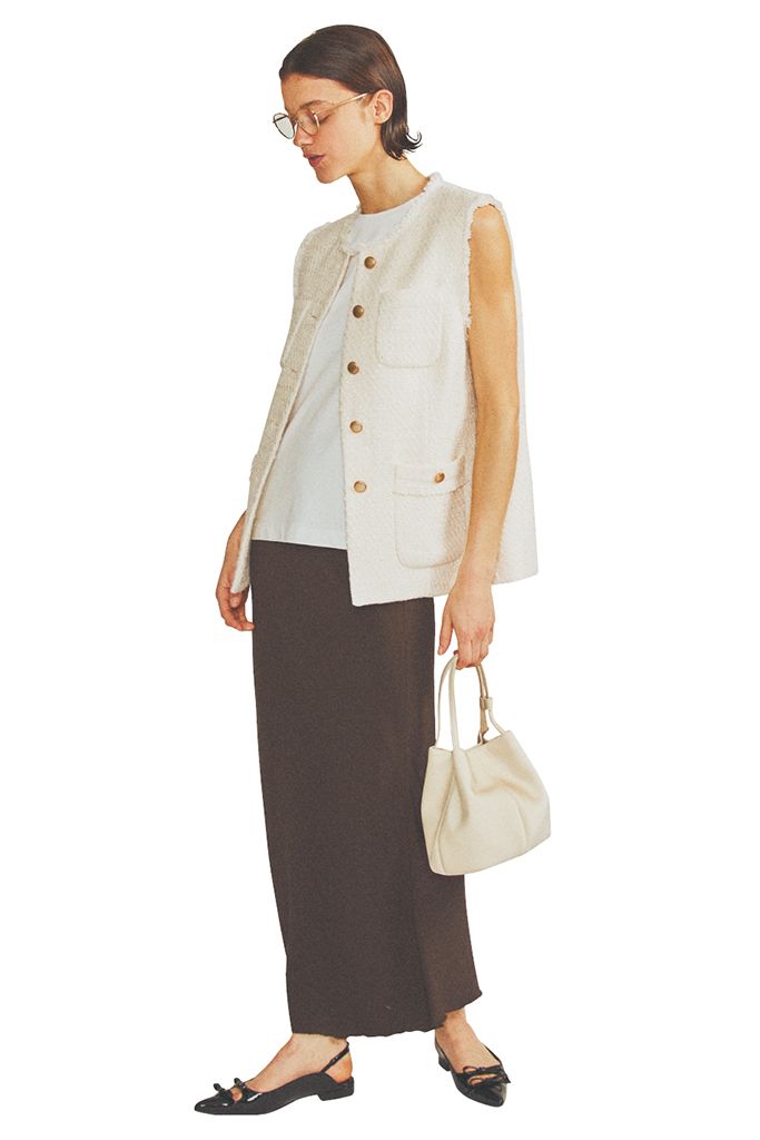 白ノースリーブTシャツ/GISELeオリジナル ツイードジレ/STATE OF MIND(ゲストリスト) スカート/TODAYFUL(Life’s 代官山店) 眼鏡/Oliver Peoples(ルックスオティカジャパン カスタマーサービス) バッグ/ルメン パンプス/TSURU By MARIKO OIKAWA