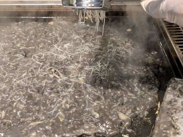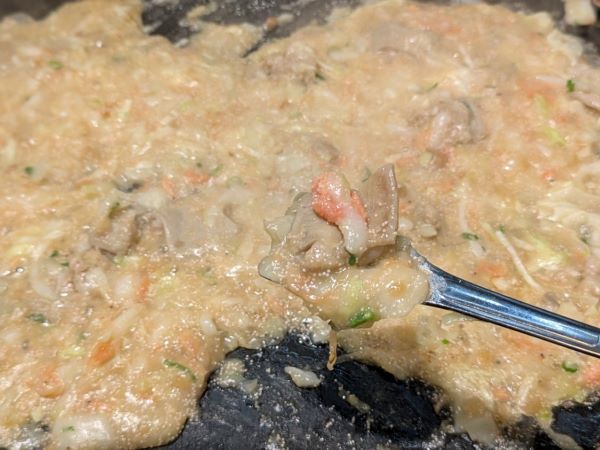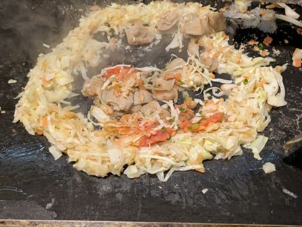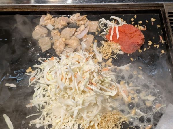 いよいよ調理開始!1枚目の「明太モツもんじゃ」は、鉄板に流し込んだ具材が温まってくると、早速鉄板から香り高いだしの香りがしてきましたよ。
