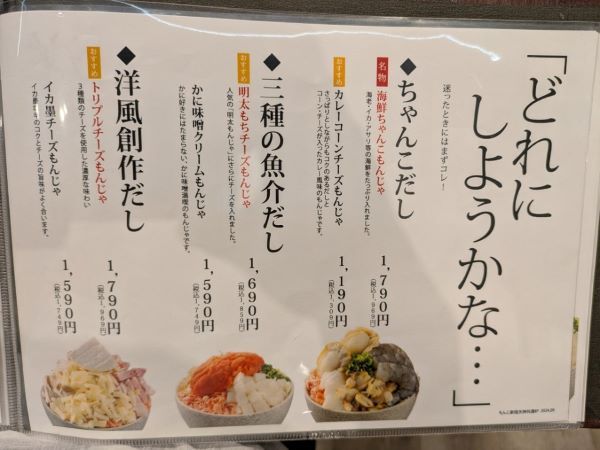 7月1日(火)から発売の天神大名店限定販売「明太もつもんじゃ」 は、他にも餅やチーズ入りのメニューもあります。1枚を2.3人でシェアして、ワイワイ楽しく色々なもんじゃを楽しむのもお勧めですよ。説明書きもあるので、自分で焼くこともできます。