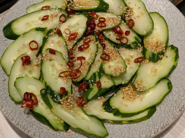 もんじゃの用意ができるまで、ドリンクと共におつまみ系のメニューもいただきます。ピリ辛の「かっパッチョ」(605円)はお酒も進みそう。