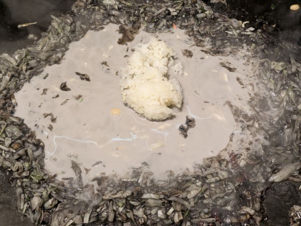 2枚目の「イカ墨チーズリゾットもんじゃ」には、パルミジャーノレッジェーロとミニご飯が付いてきて、まるでイタリアンのようです。にんにくローストとアンチョビをかけ合わせた、にんにく香る洋風テイストのだしがベース。