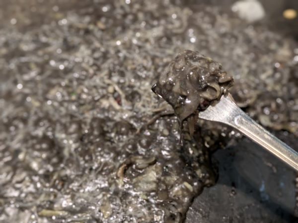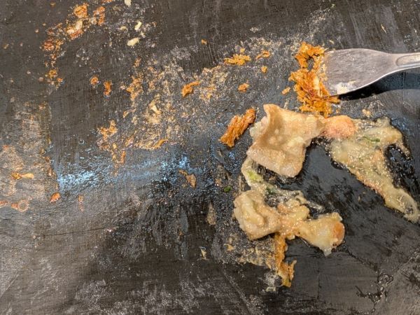 3分ほどで完成しました!小ベラで一口すくって頬張ると、深い味わいの生地に、プルプルの国産牛もつとプチプチ食感の明太子がマッチして、正に福岡の味!もつは、茹でてから下味をつけているので臭みもなく、何も付けずともおいしくいただくことができました。