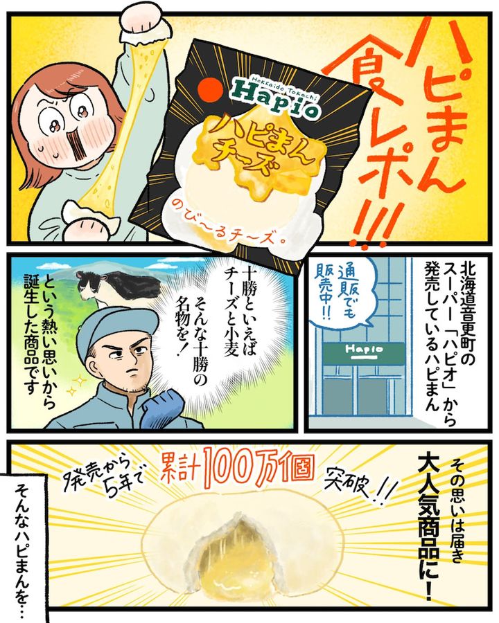 こんにちは!Instagramで日々の暮らしを漫画で紹介している、Web漫画家のmomoです。このたび、北海道音更町のご当地スーパーで大人気を博しているという商品を試食する機会がありまして。その名も「ハピまん」!販売開始から5年で、なんと累計販売数100万個を突破したという人気の秘密は、北海道産100%チーズの"とろけっぷり"にあるそうですが…?漫画で詳しく食レポしま~す♪