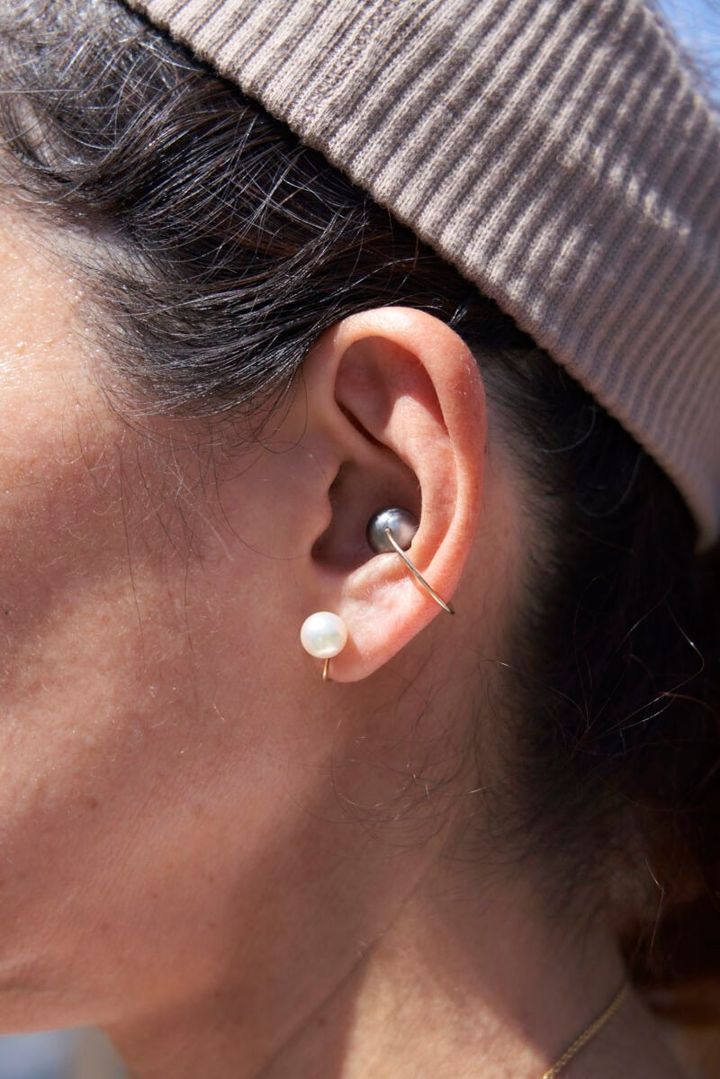 左耳には、白パールのイヤリングと黒パールのイヤーカフをつけました。パールの上品さをそのままに、かしこまりすぎない耳元がおしゃれです。