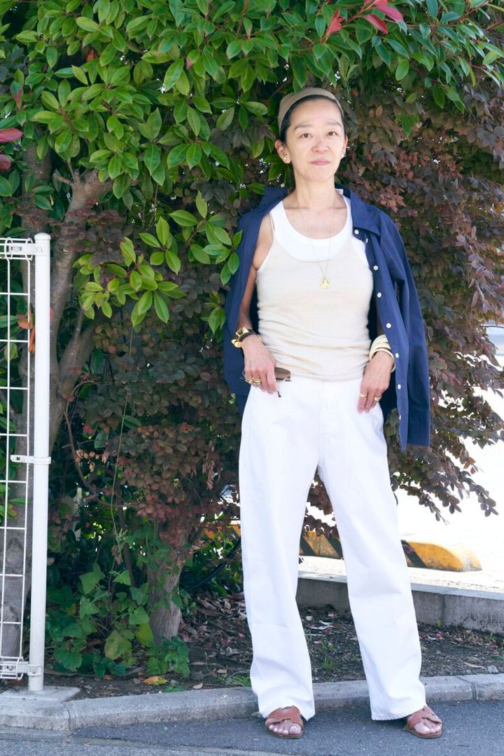 夏のデニムコーデに外せないのが、ホワイトデニム。「主役のデニムに、トップスやインナー、貝殻や象牙ライクなバングルなど小物まで、さまざまな白を合わせました」と鈴木さん。ストレートなシルエットのデニムには、タイトめのノースリーブニットを合わせて、インディゴブルーのシャツを肩からはおりバランスをとりました。絶妙な肌の見せ方にも注目! ターバンでコンパクトにまとめたヘアも、クールな着こなしにぴったり。