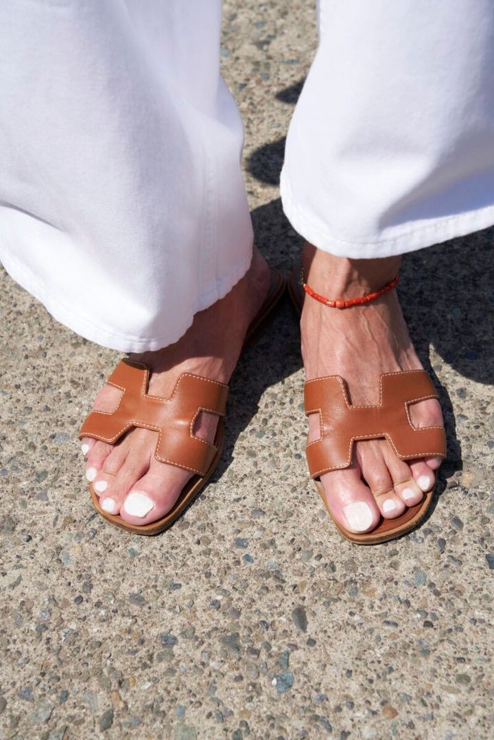「はき心地もいいし、夏のデニムコーデには欠かせないサンダル」と鈴木さんが定番にしているのが、エルメスのレザーサンダル「オラン」。白デニムとの相性も抜群で、毎日お守りのようにつけているサンゴのアンクレットも映えます。