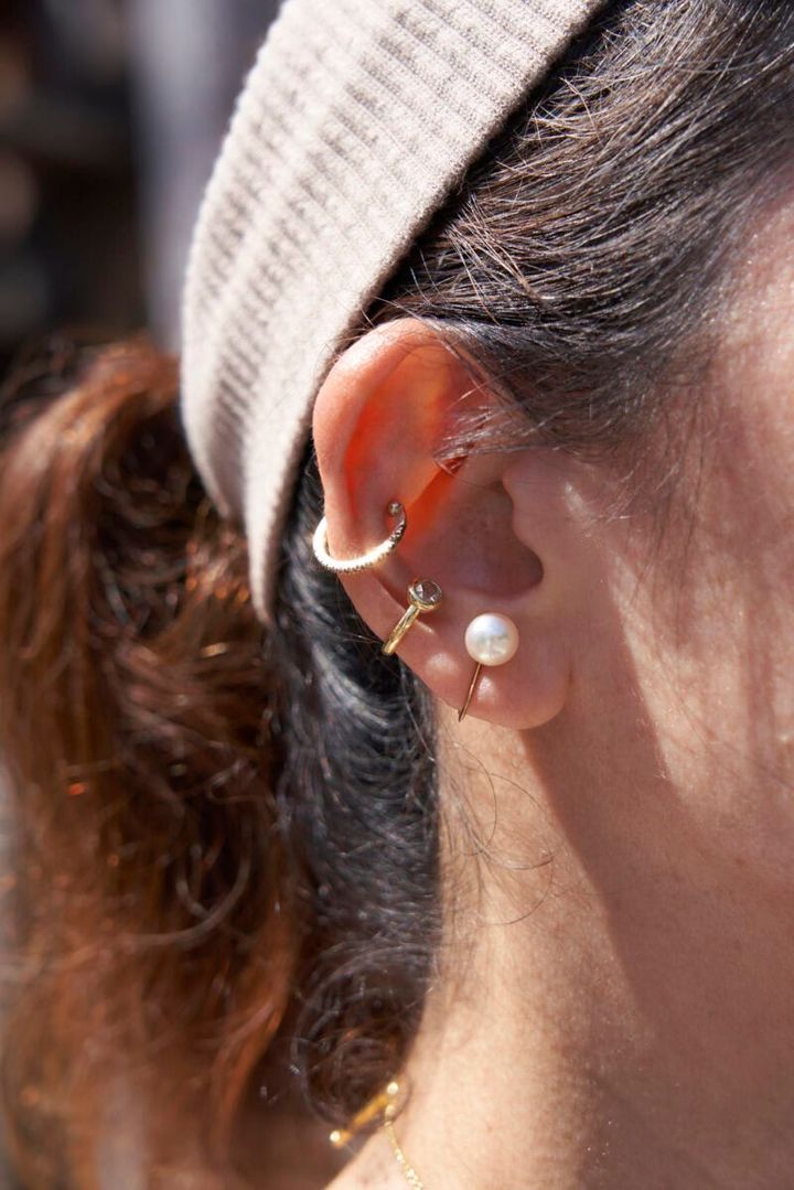 「ホワイトデニムのコーデには、パールが似合う」と鈴木さん。左右でイヤリングとイヤーカフをアシンメトリーにつけて、耳元を品よくモードにまとめました。