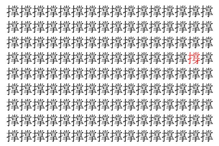 画像の中には、「撑」という漢字が縦に9行、横に16個並んでいます。 全部で144個となりますが・・・、そのうち1つは「異なる漢字」となってますよ!!