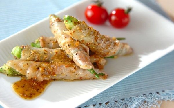 オクラの肉巻きにニンニク、粒マスタード、バジルが効いていて新感覚! 風味豊かな洋風ソースなので、ワインやパンとも好相性です。いつもと違う雰囲気で楽しみたい日にいかがでしょうか。