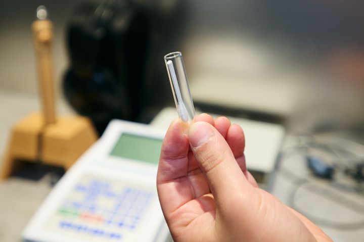 ヘッドフォンのような形の機器に採取した綿棒を入れたガラス管をセット。