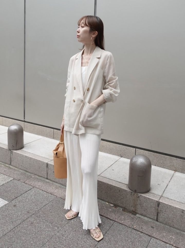 「華奢なストラップで品よくはけるサンダルに合わせて、ニュアンスカラーのコーディネートに。洗練された雰囲気に決まるホワイト×ベージュの組み合わせは、これからの季節にオススメです」