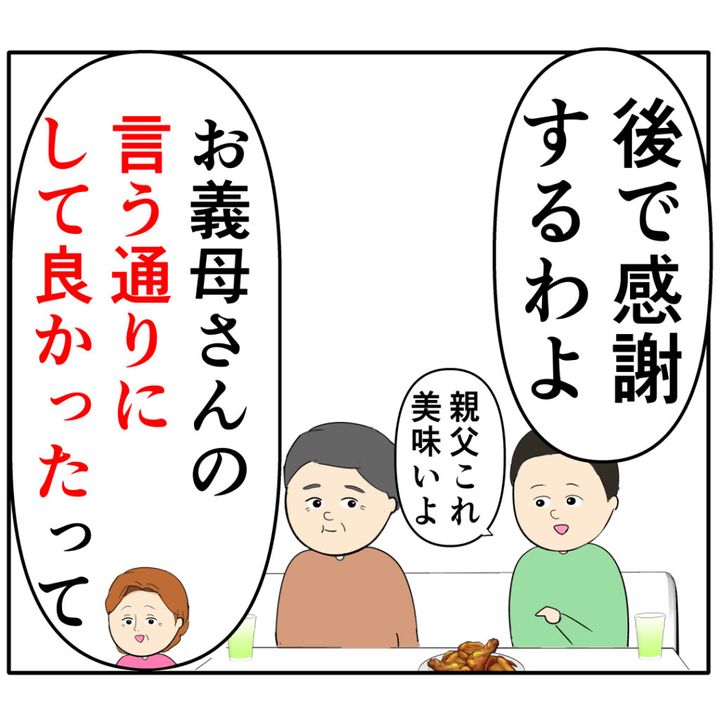 「後で感謝するわよ。お義母さんの言う通りにして良かったって」と言いたい放題の義母の話も聞かず、「親父これ美味いよ」と次郎さんは義父に話しかけていました。