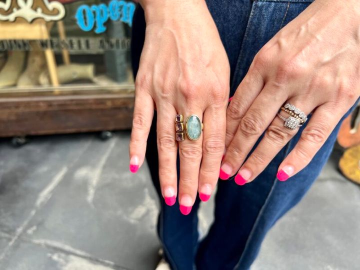 大人世代に根強いファンを持つ、京都発「ririchuchu」のオリジナルジュエリー。3,000円代のプチプラから、ダイヤのものまで幅広いラインナップゆえに、訪れるたび新しい作品に出会える。ネイルも元気になれるピンクで!