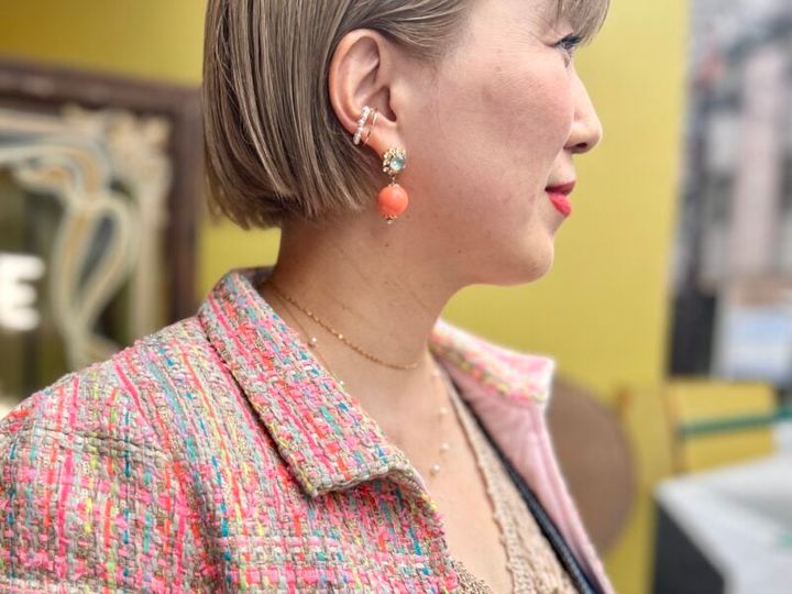 「ririchuchu」の繊細なジュエリーの重ね付けに、オリジナルのお花スワロフスキーピアス。顔まわりでも色がポップなアクセントに。
