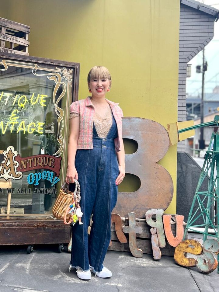 京都・三条通で、誰よりも元気な笑顔を見せてくれたのは、セレクトショップ「ririchuchu(リリチュチュ)」店主のririさん。「朝から雨だったので、蛍光ピンクのジャケットからパワーをもらって、気分を上げてきました」。お気に入りのボレロ風ツイードジャケットは、フランスのブランド「ANAMAYADESIGN」。「黒が似合わなくて。でも逆に、どんなに派手にしても似合うんです」。