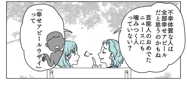 「子どものクラスLINEって、誰のお母さんかわかりにくいから、子どもの写真にしてもらえると助かるよ。不幸体質な人は、全部幸せアピールだと思うのかもね」「不幸体質?」「だって芸能人のおめでたニュースにも噛みつく人っていない? 幸せアピールウザイって叩く人いるでしょ」