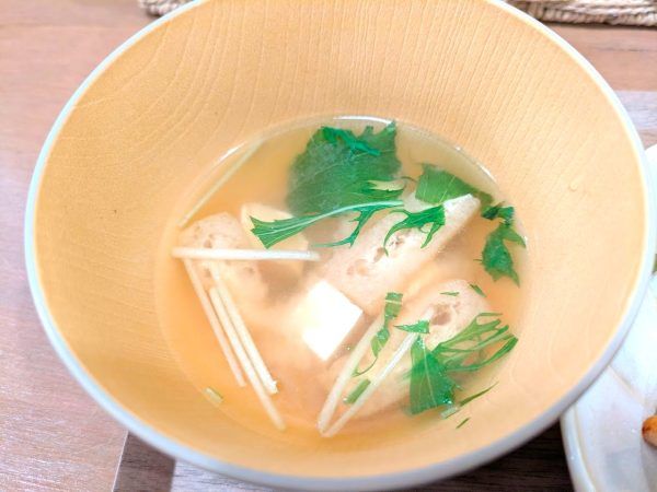 水菜とお豆腐と揚げのお味噌汁も健康的でやさしい味わいです。