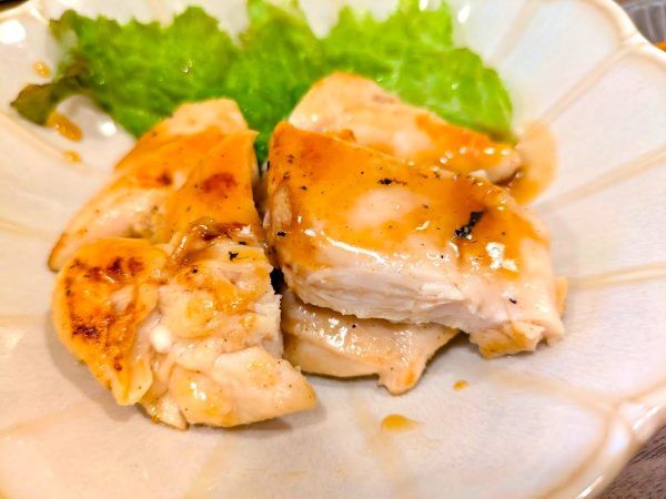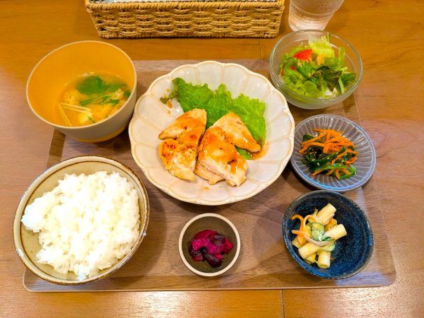 食欲をそそるいい匂いがします。ささみは淡白な味ですが、ガーリックと醤油の力強い香りとやわらかな食感がたまりません!おかずが多くて健康的な本日のごはんは、日替わりでメインも小鉢も変わるので楽しみですね~。