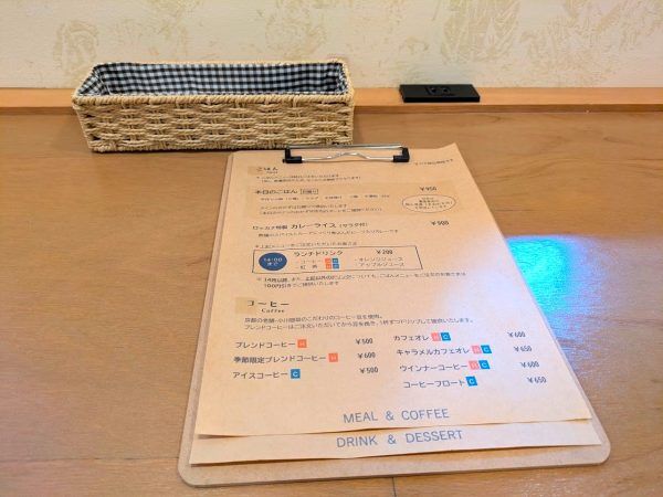 ごはんメニューは、本日のごはん(日替わり)950円とロッカナ特製カレーライス(サラダ付き)900円で、14時までランチドリンクが200円です。コーヒー・紅茶・オレンジジュース・アップルジュースがあります。喫茶のコーヒーは、京都の老舗「小川珈琲」のこだわりのコーヒー豆を使用し、ブレンドコーヒーは注文をいただいてから豆を挽き、1杯ずつドリップして出されるそうです。お店は電源・無料Wi-Fi完備だそうです。