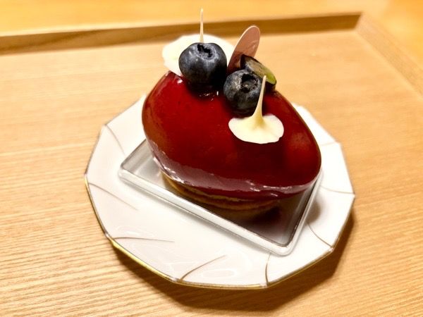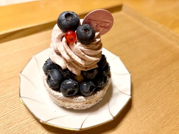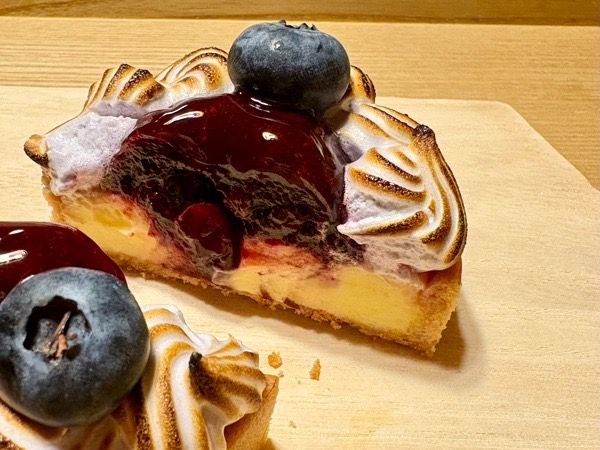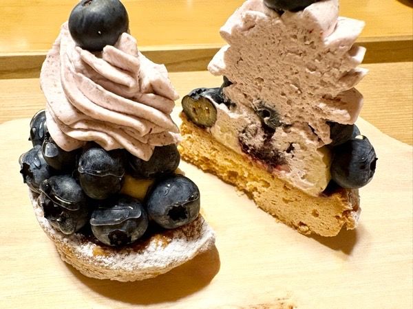 タルト部分は、普段いただいているタルトとは趣が異なり、厚めのサブレのようなサクホロ食感で、少し塩味が効いています。その上にブルーベリークリームと大粒の富谷産ブルーベリーがたっぷり!ブルーベリーを思う存分楽しめて、大満足です。